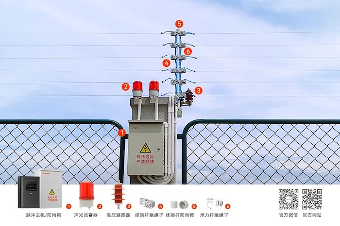In case of forced intrusion, the electronic fence will provide a pulse high-voltage strike within the safe energy range, warning illegal intruders and shaking their ability and motivation to climb over the fence. At the same time, the system emits a high decibel sound alarm on site and is linked with other security systems (such as alarm hosts, monitoring systems, etc.) to achieve the purpose of safety obstruction.