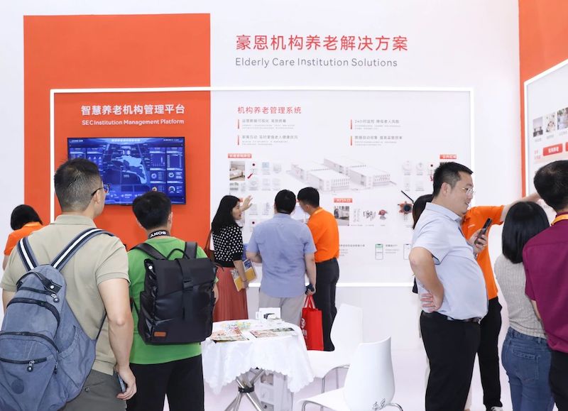 在4號館4D60展位上,豪恩橙色展臺獨樹一幟,現場展示了智慧養老綜合管理平臺、社區+居家養老解決方案以及機構養老解決方案三大展區,吸引了行業內眾多企業與專家參觀。