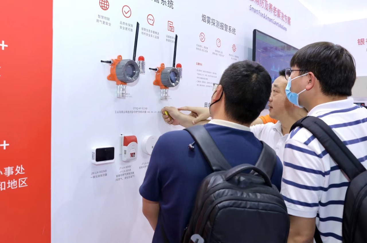 在展會左側墻面,智慧消防“1+N”解決方案成為了現(xiàn)場焦點,該解決方案涵蓋煙霧探測報警、可燃氣體報警、傳統(tǒng)消防改造等六大系統(tǒng),可以實現(xiàn)水、電、煙、氣、火等在內的實時監(jiān)測,建構“智慧消防火災防控一張網”。