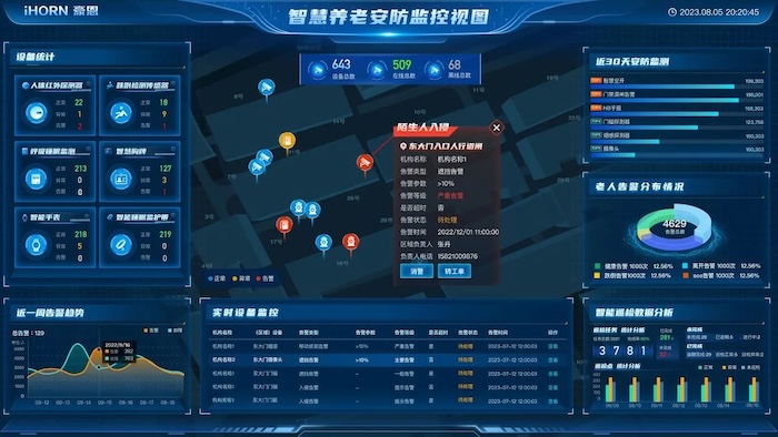安全監測設備(煙霧報警器、燃氣報警器、跌倒探測器、人體移動探測器、門窗傳感器、水浸傳感器等)可24小時在線監測,一旦發現異常情況將實時告警,并將報警信息傳送至監管平臺。機構工作人員可迅速定位告警房間位置,把握黃金救援時間;
