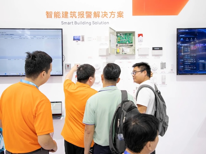 智能建筑報警解決方案現場展示了LHB9000Pro報警主機以及紅外探測器、燃氣報警器、緊急按鈕等多款產品,主要用于人員密度大、流動性強、區域廣、環境復雜等場所的相關人員、財產、物品安全問題,實現智能建筑場所全方位、立體化安全防范。
