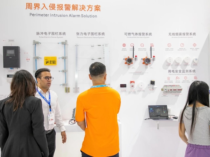 周界入侵報警解決方案現場展示了脈沖電子圍欄系統和張力式電子圍欄系統,由管理軟件、圍欄主機、控制鍵盤和前端探測圍欄組成,報警功能豐富,具備多種聯網與對接方式,系統兼容性強,可提升周界安全等級,廣泛應用于小區、學校、工廠、機場、醫院等場所的周界防護。