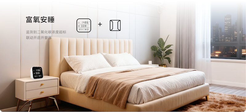 富氧安睡:當豪恩空氣質量檢測儀監測到二氧化碳濃度過高時,自動聯動開窗器通風,不影響睡眠,保障整夜富氧環境。