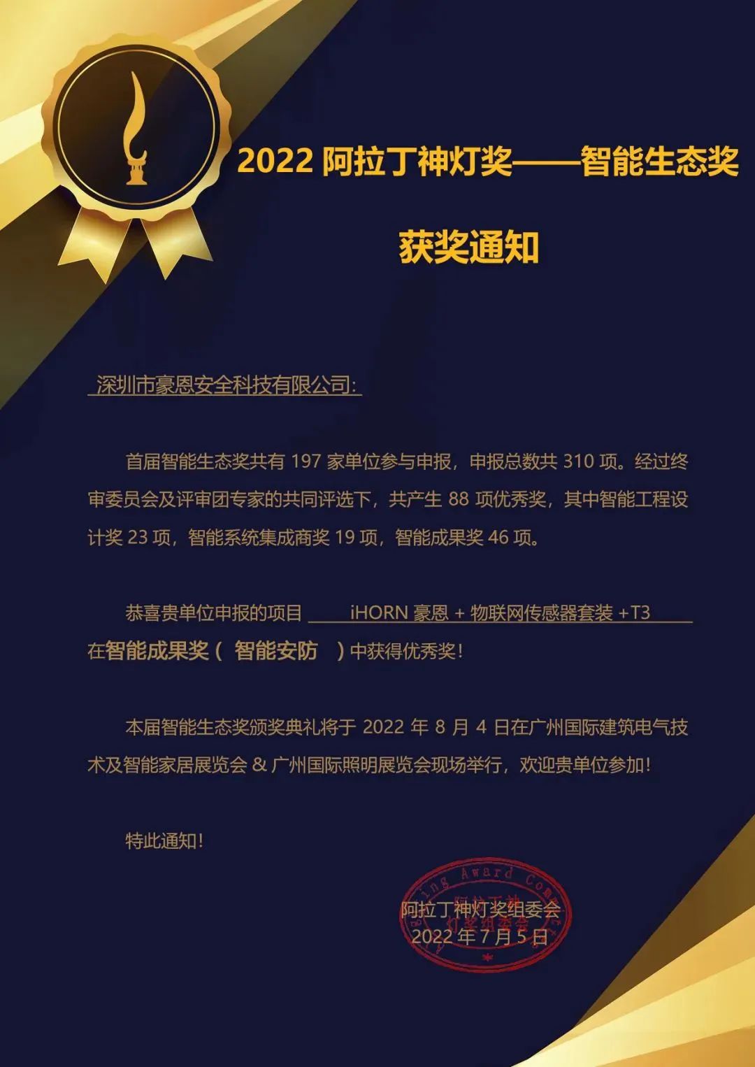 中安科子公司豪恩智能家居傳感器T3系列榮獲“2022阿拉丁神燈獎——智能生態獎”