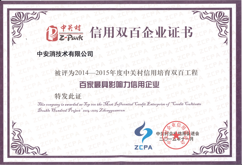 2015年11月17日,中關村企業信用促進會發布了“2015中關村信用雙百企業”獲獎名單,中安消技術有限公司憑借多年積累的社會信任度以及對中關村科技、經濟的貢獻,再獲 “2015年中關村信用雙百企業——最具影響力企業”稱號。