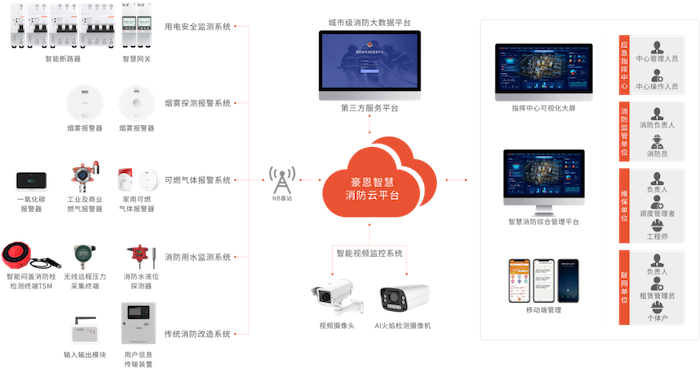 豪恩智慧消防解決方案以云平臺核心,搭載煙霧探測報警、可燃氣體報警、用電安全監測、消防用水監測等各個系統,充分運用5G、大數據、云計算、人工智能等前沿技術,建成由監控服務中心、云平臺、移動應用、智能設備等組成的智慧消防火災防控預警一張網,實現水、電、煙、氣、火等在內的實時監測,讓火災隱患無處遁形,打通智慧消防最后一厘米,讓消防更智慧,讓城市更安全。